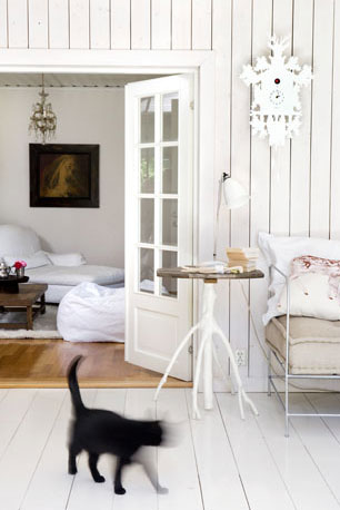 Em todas as fotos que eu vejo o uso total do branco em ambientes, nesses sites e blogs em que eu garimpo as imagens, vejo sempre a mistura do branco com móveis em madeira natural, muitas vezes bem antiga, como nesse aí: mesa e cadeiras bem antigas de madeira, e peças tão antigas quanto, mas brancas. Nessa foto, um criado mudo pintado de branco faz papel de aparador.O legal aí também é o uso de moldura de gesso, para teto, como prateleira.