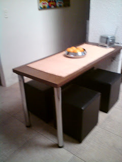 E lá em casa, na cozinha, fiz uma mesa com uma porta lisa, a qual mandei folhear com madeira tipo tabaco e coloquei duas pernas em inox, numa ponta.A outra ponta está fixa na parede lateral do meu armário.Ela acabou cumprindo a função de um balcão, pois a minha cozinha é o que se chama de "cozinha americana".No dia a dia, eu a uso para as minhas refeições, inclusive ali em cima dela, uma tv pequena, pois adoro comer vendo tv e não gosto de fazer isso na sala de tv.Para jantares ou almoços onde recebo convidados, existe a mesa de jantar que vai estar na sala de jantar, que ainda está no papel, mas até o fim do ano eu realizo.