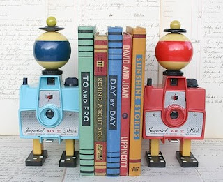 Apoios para livros , feitos com peças de brinquedo, máquinas fotográficas antigas, de plástico,frutas de plástico, formando um bonequinho,um robôzinho...