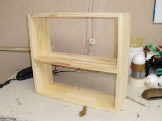 Daí, foi só colar a prateleira do meio (que não ficou exatamente no meio, pois eu queria um dos espaços um pouco maior, para objetos mais altos) e a parte de cima.